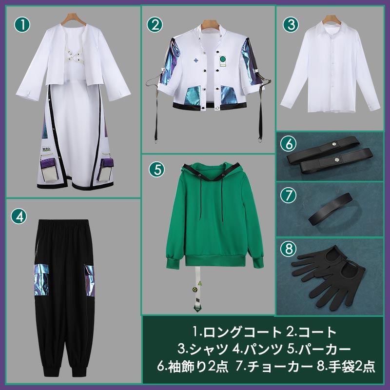 ロングコート、コート、シャツ、パンツ、パーカー、飾り物(袖飾り2点、チョーカー、手袋2点)