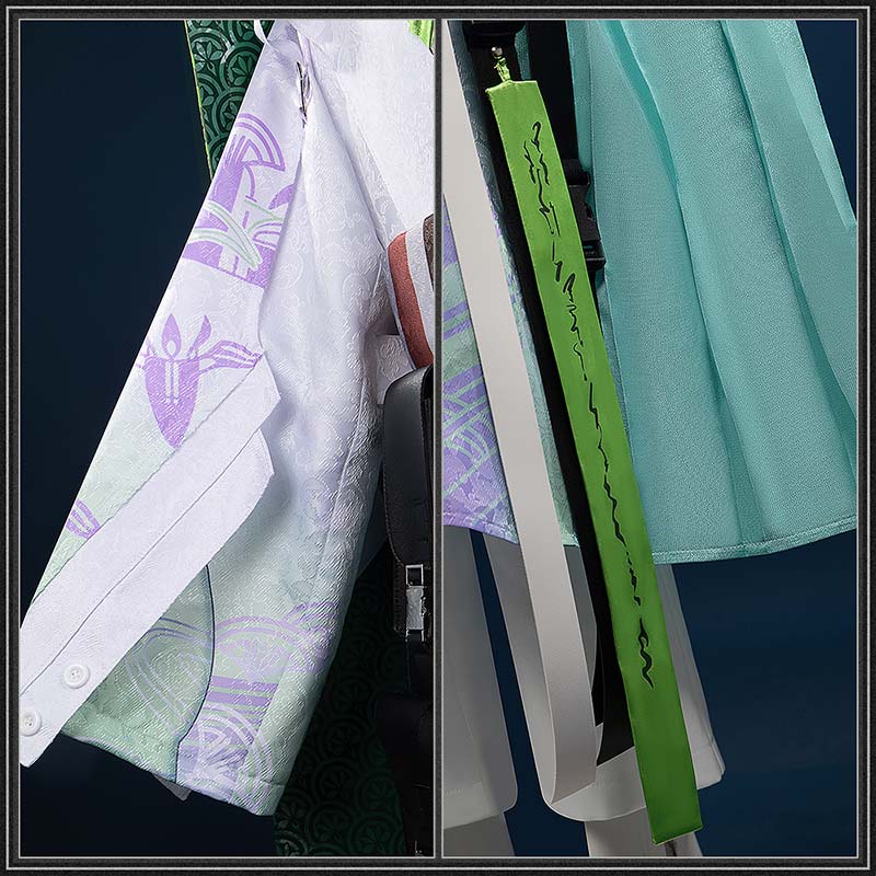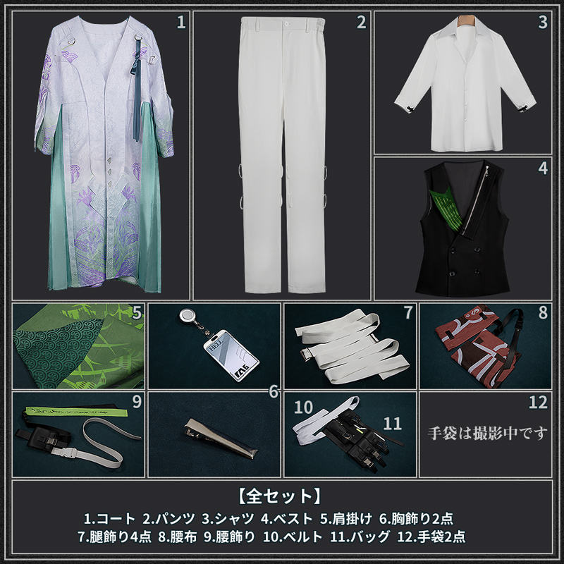 コート、パンツ、シャツ、ベスト、飾り物(肩掛け、胸飾り2点、腿飾り4点、腰布、ベルト、バッグ、手袋2点)