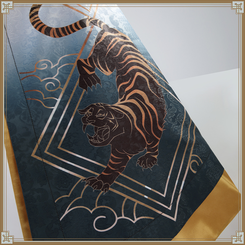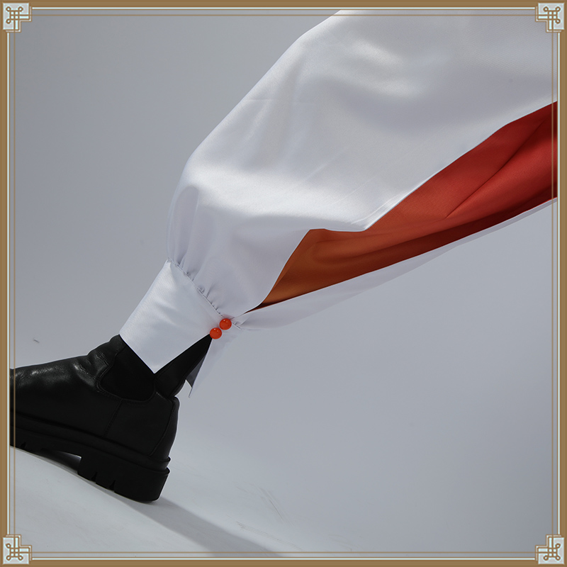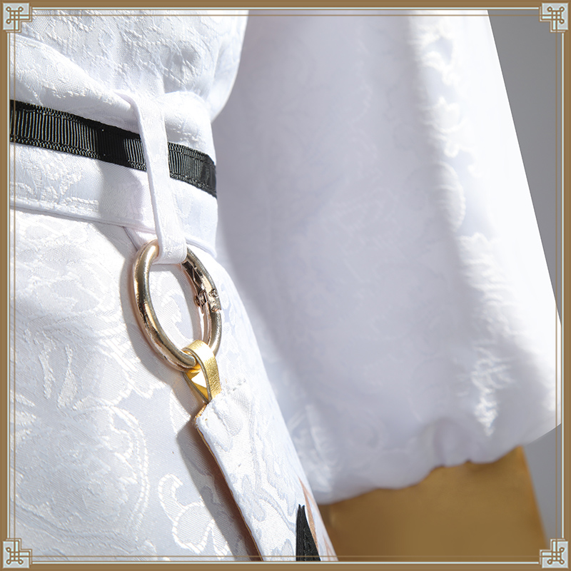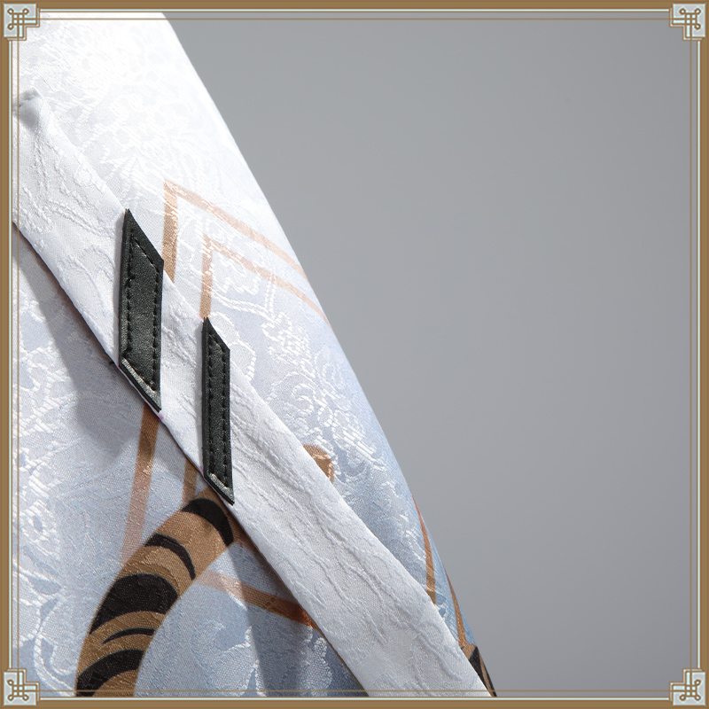 ジャガード生地で製作しています。白を基調として、襟に中華風の絵柄がプリントされて再現度が高いです。
