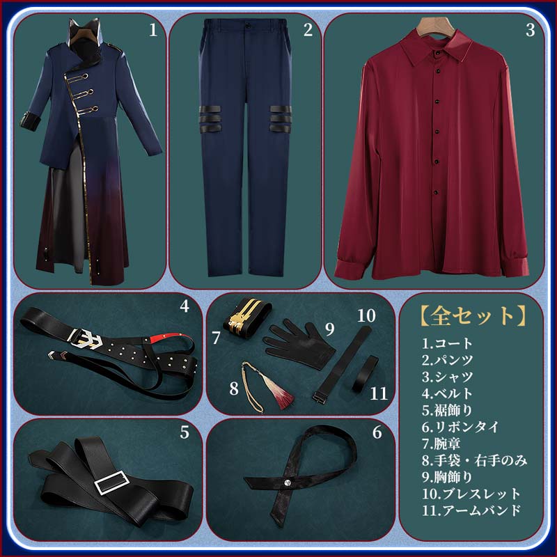 コート、シャツ、パンツ、飾り物(ベルト、裾飾り、リボンタイ、腕章、手袋右手のみ、胸飾り、ブレスレット、アームバンド)