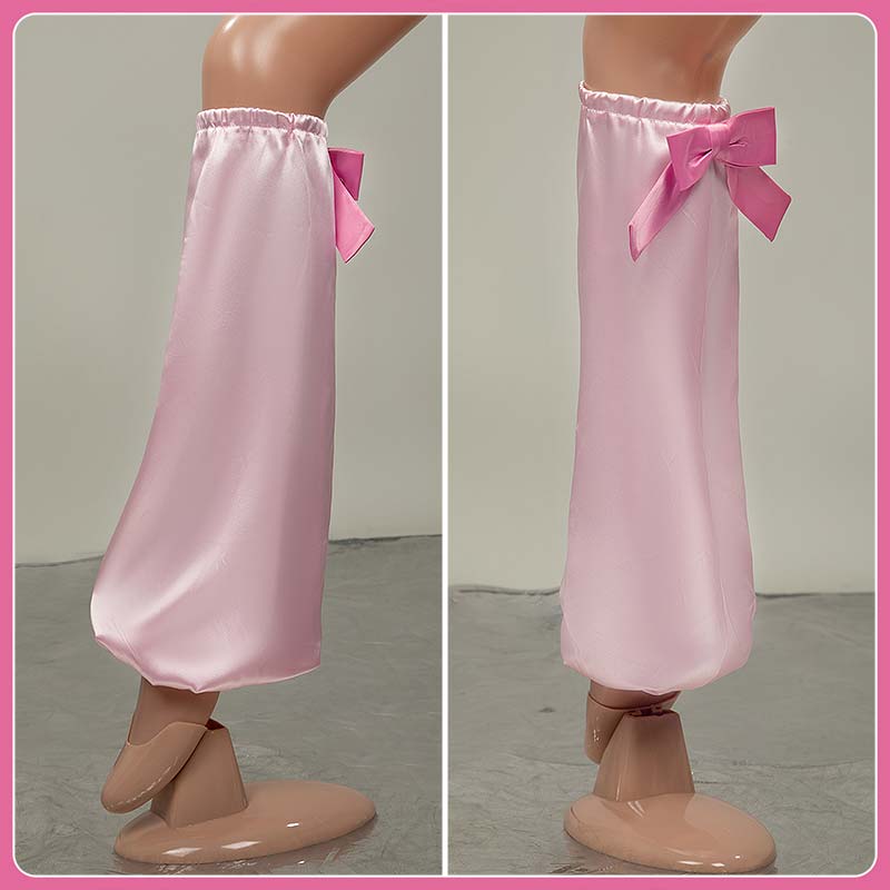 マットサテン+ポリエステルサテンで製作しています。上段は淡いピンク、下段は濃いめのスイートピンクのグラデーションで、動くたびに甘い光沢が揺れます。バックには特大のリボンとゴールドのΩチャームが付いたハート飾りがドーン!
