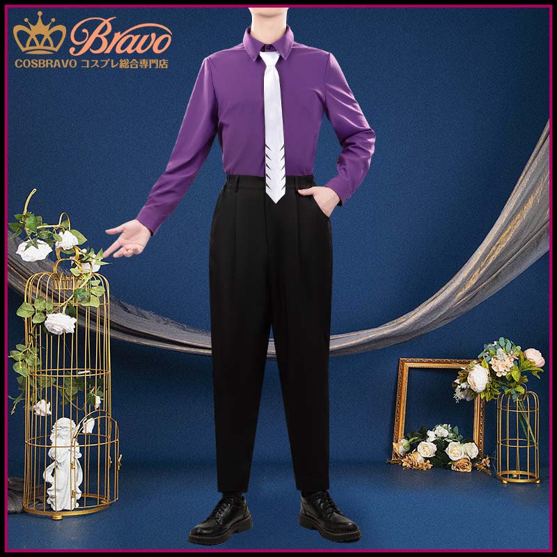 シャツ生地で製作しています。シンプルながらもコートの黒とネクタイの白とのコントラストが強く、キャラクターのクールで冷たいイメージを際立たせます。