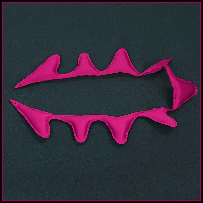 TRサージで製作しています。ラペルや裾、袖口に鮮やかな色のアクセントが施され、独特の毒々しくもスタイリッシュな印象を与えます。裏地はピンクとオレンジのグラデーションのような抽象的な柄が入っており、コートを開くと視覚的にインパクトがあります。