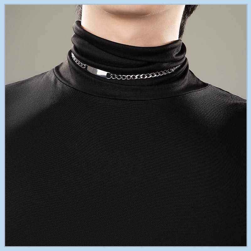 ミルクプロテインニットで製作しています。シンプルな黒無地ながら、ネックレスの装飾により華やかさを加え、コートを脱いだ状態でも単独でスタイリッシュに見えるよう工夫されています。