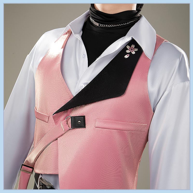 光沢布で製作しています。左側は黒いラペルと襟が付いたシャープなカットで、胸には桜モチーフのピンバッジが付けられています。バックには黒いベルトストラップとシルバーリングが配置され、調整可能な構造です。