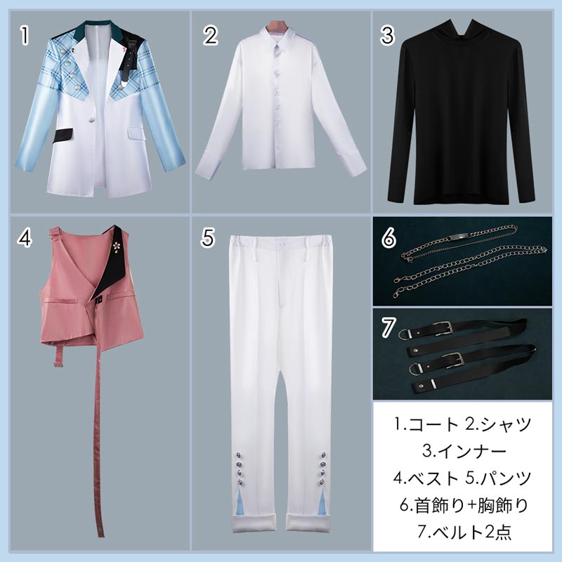 コート、インナー、シャツ、ベスト、パンツ、飾り物(首飾り、胸飾り、ベルト2点)