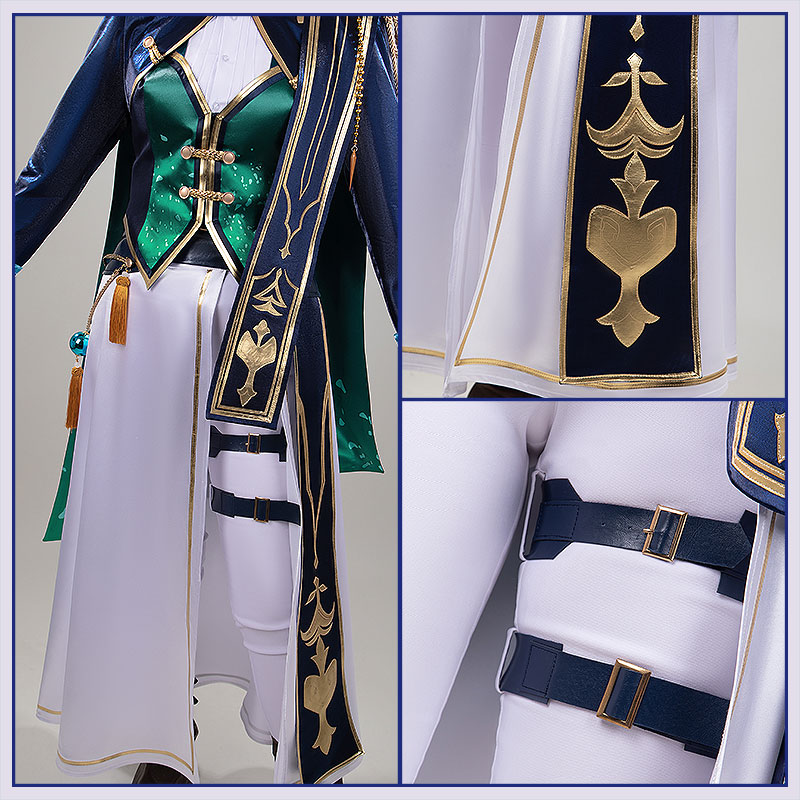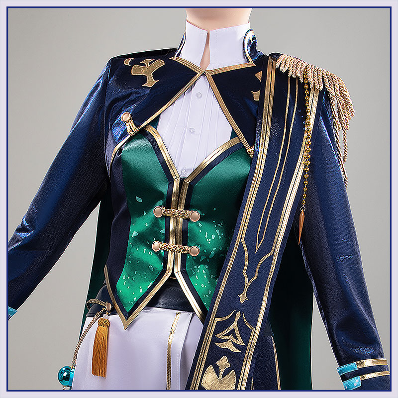 光沢布で製作しています。ブルーを基調としたマント風の上着。肩には豪華な金色のエパレットと太いロープ飾りが施され、チェーンが優雅に垂れる。