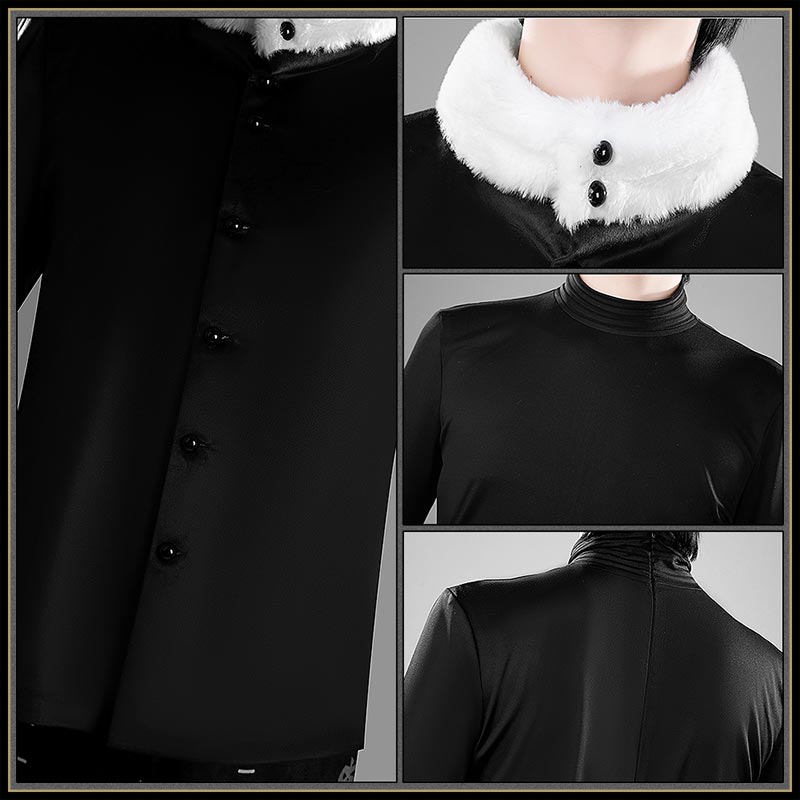 ベロア生地で製作しています。白いピンストライプと不規則なステッチ風のライン、渦巻き模様、かぼちゃがプリントされ、袖口、裾には厚みのある白いファーがあしらわれ、豪華で冬らしい印象。