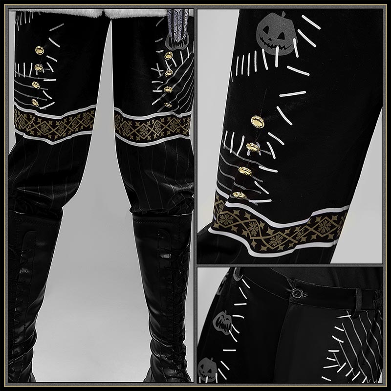 ベロア生地で製作しています。縦のピンストライプが入り、裾近くに金色の雪の結晶風のプリントとが巻かれて、膝下から裾にかけて金色のボタンが並び、全体のゴシック&クリスマス感を下半身でもしっかり表現。